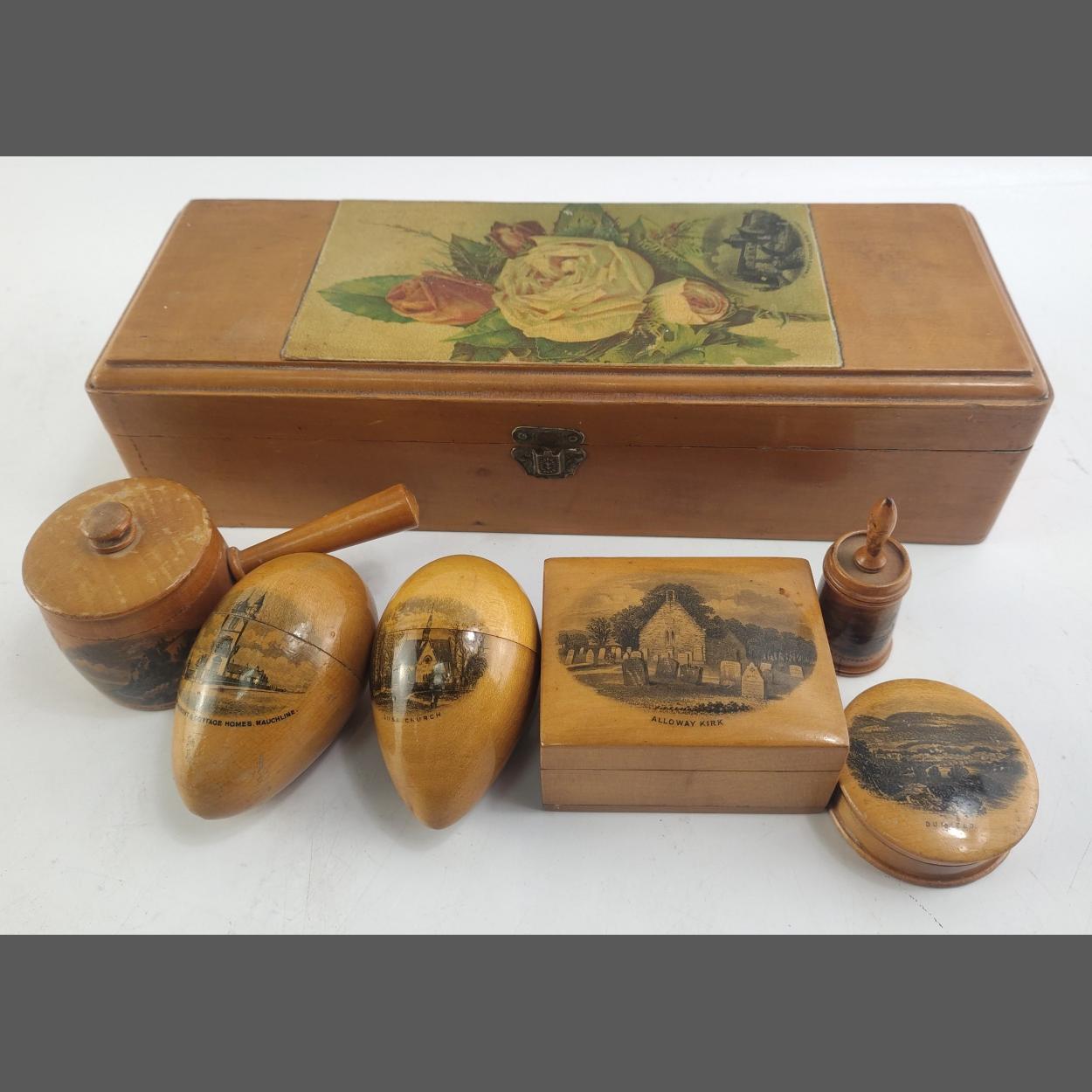 Mauchline Ware box with a collection of lovely little trinket, edd thread holders, tape measure (lacking tape) and others little boxes.