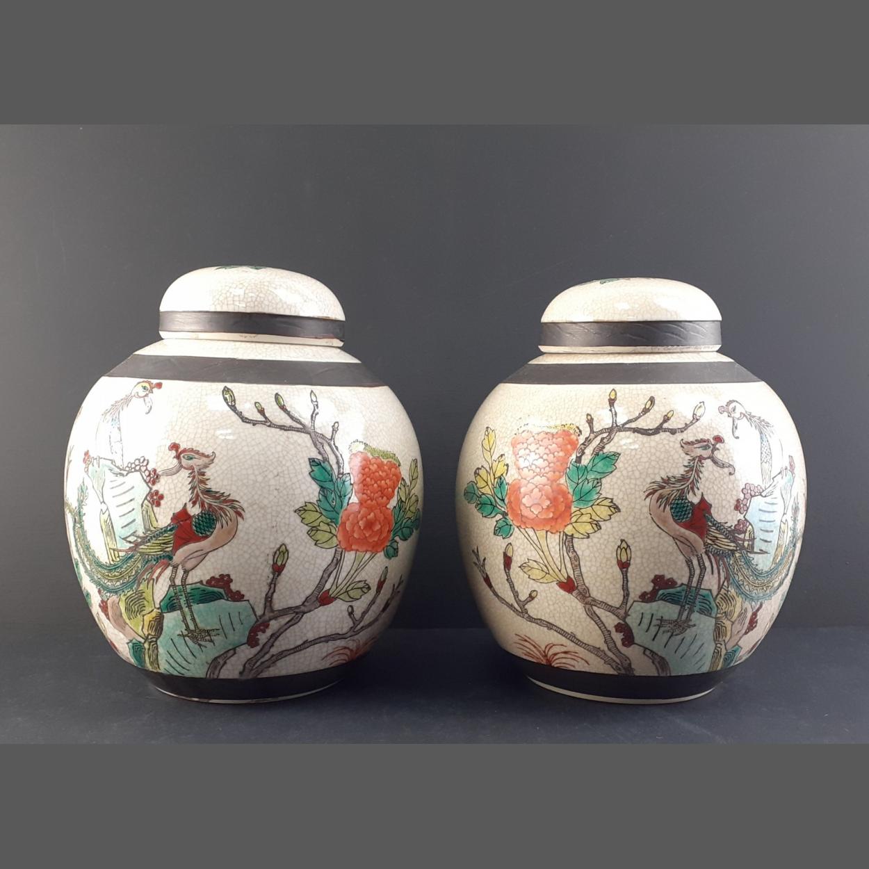 A pair of oriental lidded Ginger Jars with attractive bird and insect motifs. Each stands 20cm tall and both in good undamaged condition.