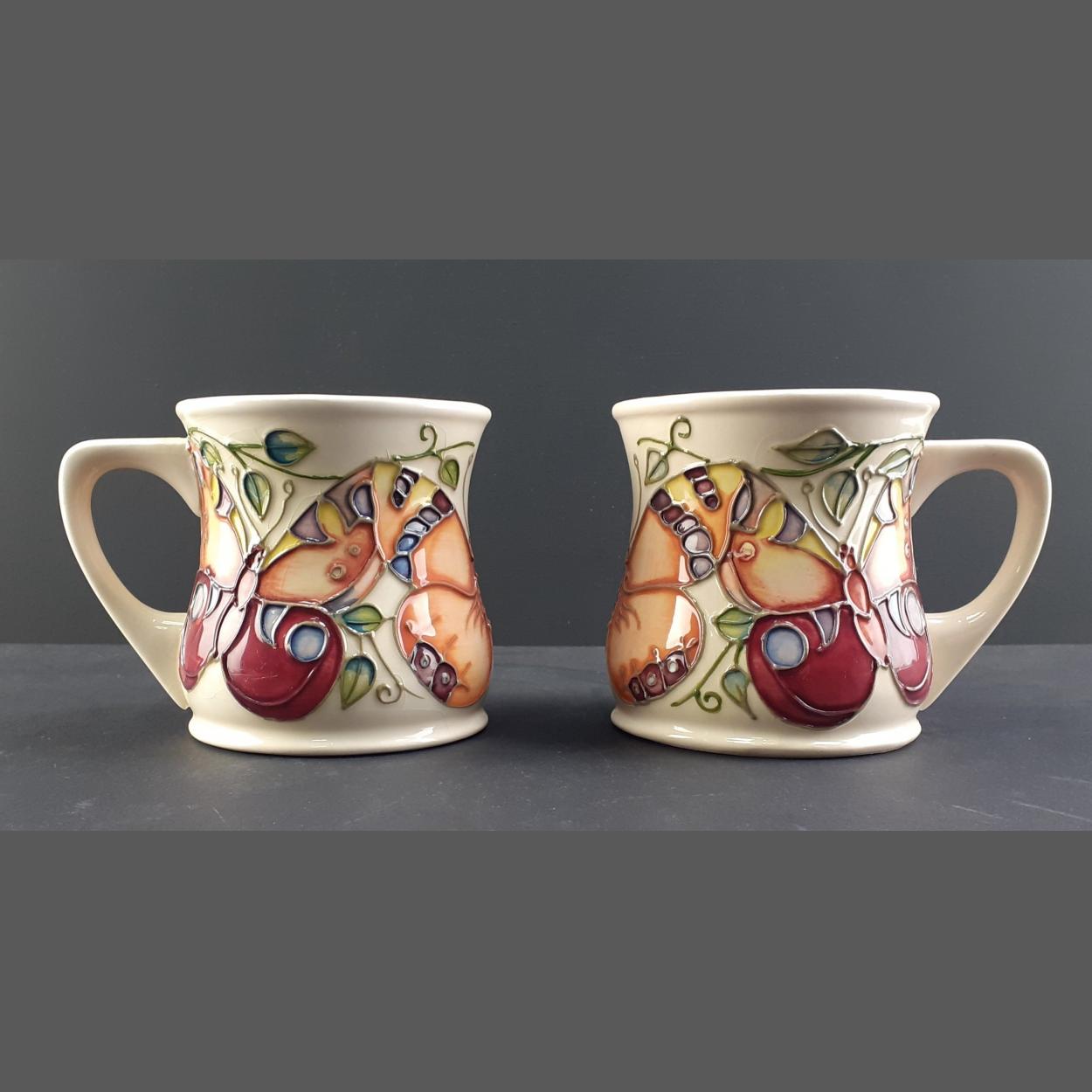 Two MOORCROFT stylish coffee mugs . One with small chip to bottom.