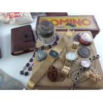 An interesting mixed lot. Comprising a plated tray and a plated tea caddy and a spitit kettle on stand. A small collection of card and other table games and an older stamp book with contents. and a trinket box.