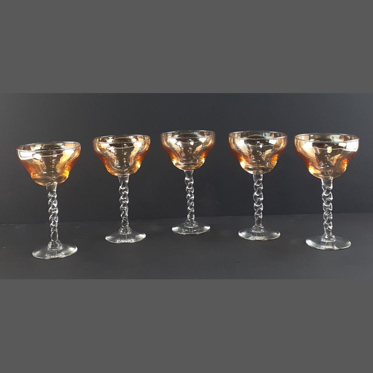 EXQUISITE set of five Italian smoky-lustre twisted stem glasses - beautiful quality! - diameter 8cm and height 15cm approx