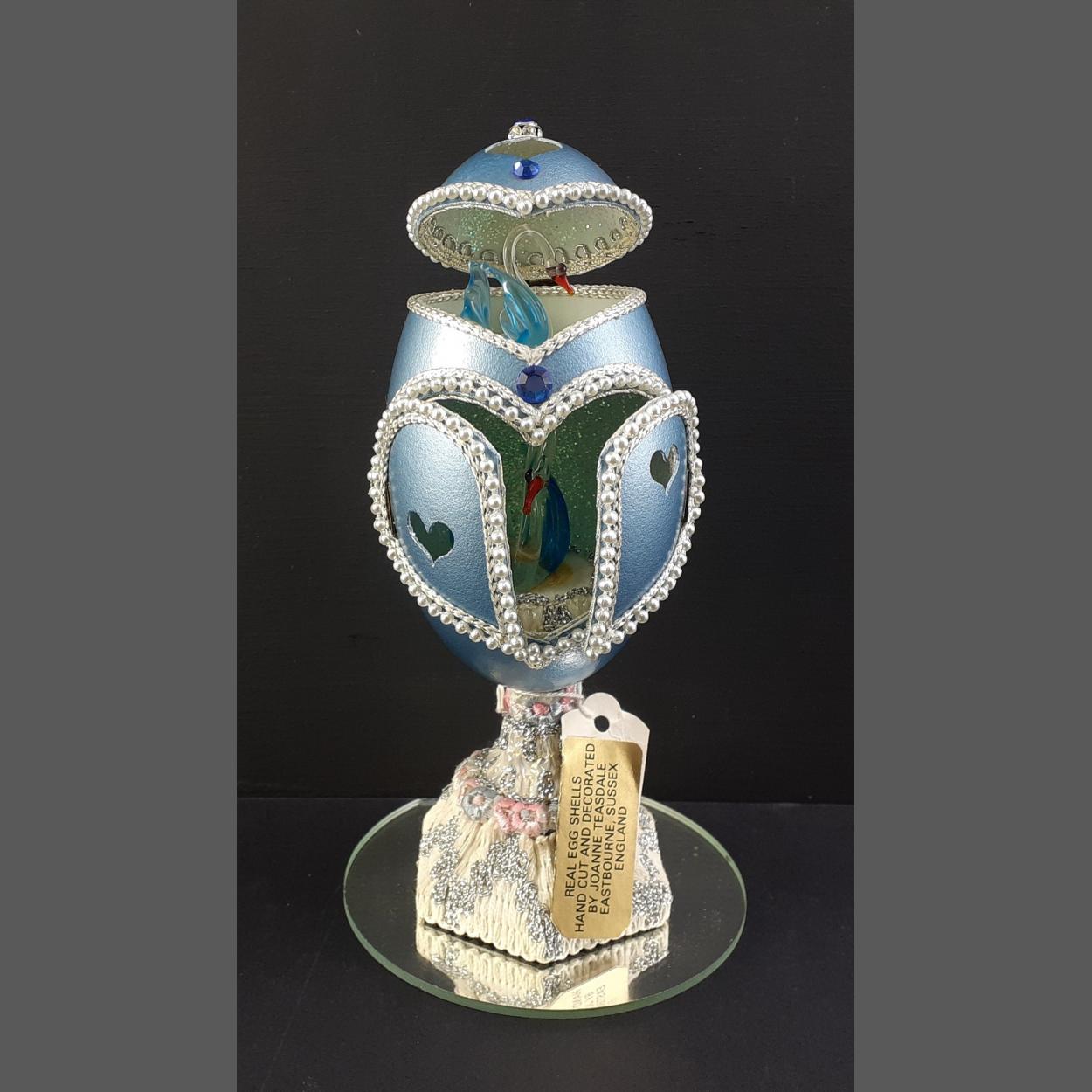 FABERGE egg style hand cut and decorated by Joanne Teasdale - features two swans within the lid and twin doors - 13cm height approx