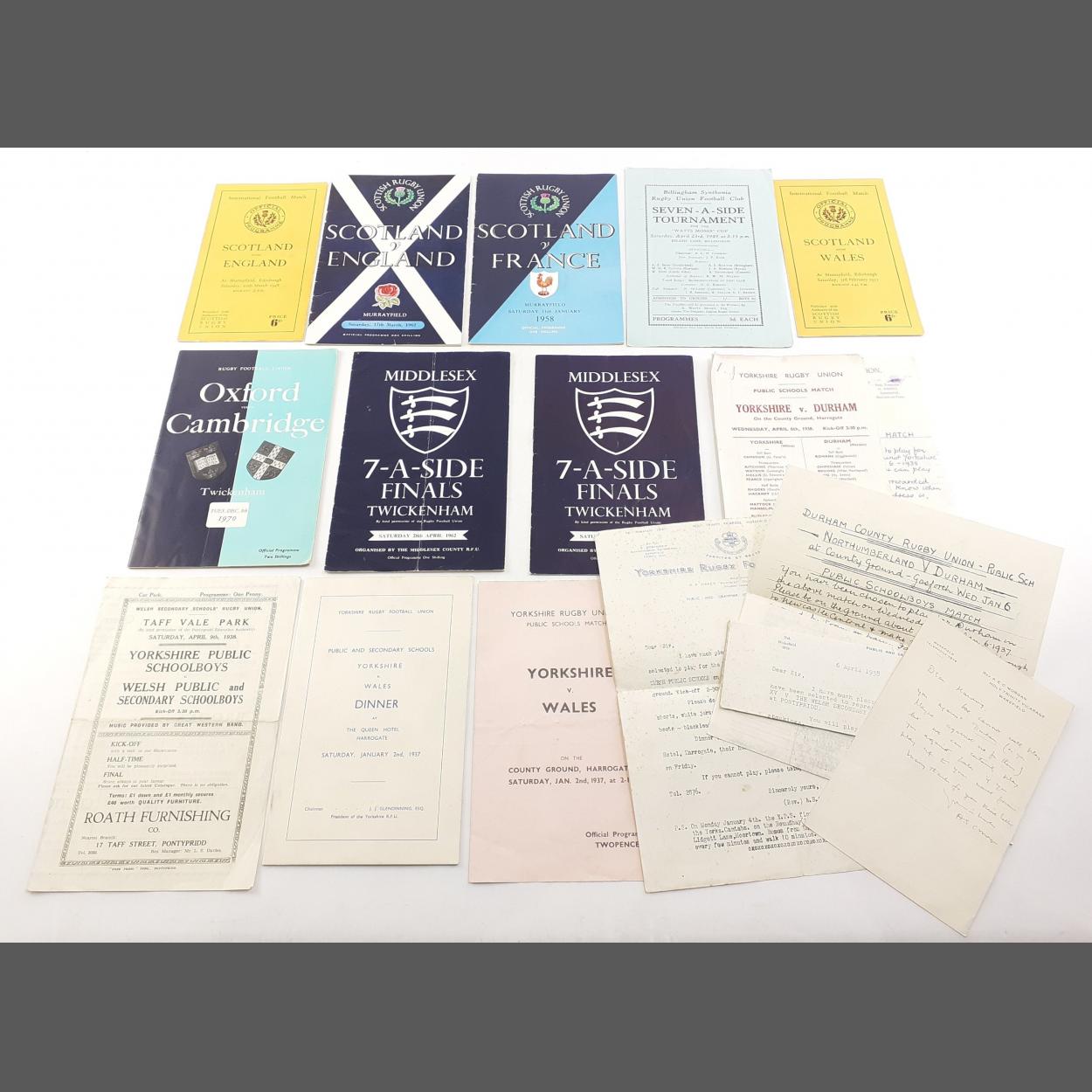 A great selection of RUGBY LEAGUE programmes including scarce 1948 Murrayfield Scotland v England, 1951 Murrayfield Scotland v Wales, 1960s Scottish Internationals and a collection of Yorkshire Schoolboys ephemera including hand written letters.