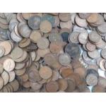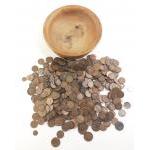 A carved wooden bowl filled with obsolete copper coinage. Mainy Pennies and Halfpennies.