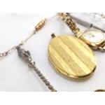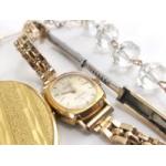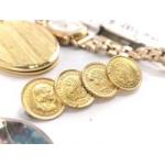 Small jewellery lot. Gilt watch, pendant, glass beads and a gilt coin brooch.