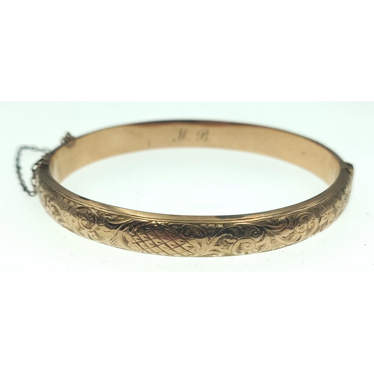 A 9ct stamped antique bright-cut snap-shut bangle with safety chain weight 8.5g approx