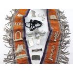 A small Trebor money box containing some Masonic insignia and a King Billy Orange lodge sash with badges etc