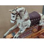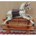 A vintage wooden ROCKING HORSE on more modern frame. Has been stripped so a wonderful basis for a restoration. Stands 85cm tall and 94cm long.
