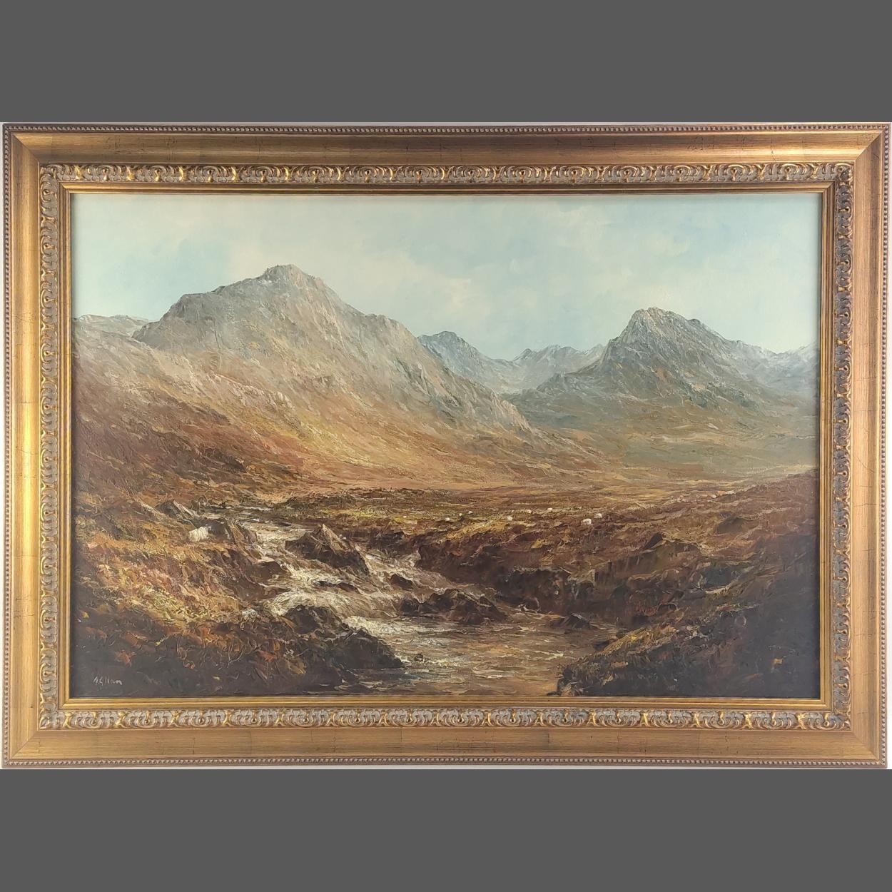 An oil painting signed Alfred Allan entitled 'Red Hills On Skye' c 1980's - 30" x 20"