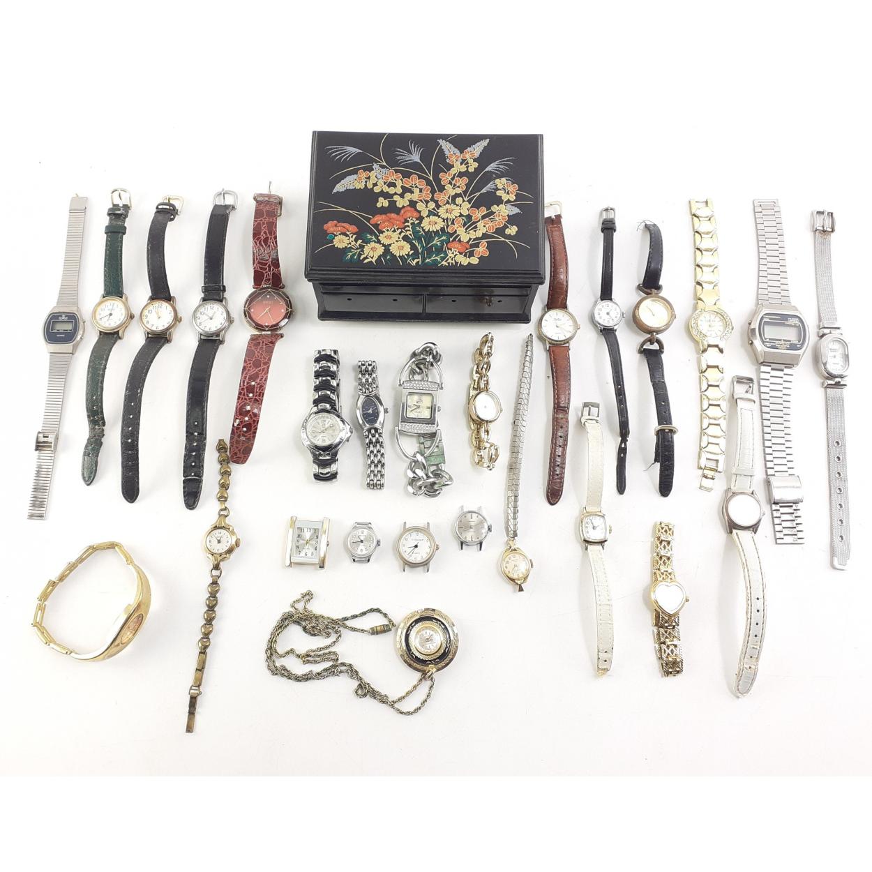 A box with a collection of over twenty ladies cocktail watches. Sekondas, Gianni Moretti, Limit and much else. Batteries will be required.