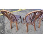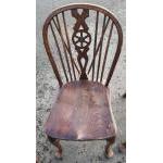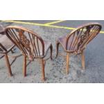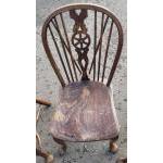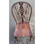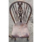 Four Victorian dark oak Wheel back armless Windsor chairs in good useable well cared for condition. Attractive more unusual curved stretchers. A lovely set.