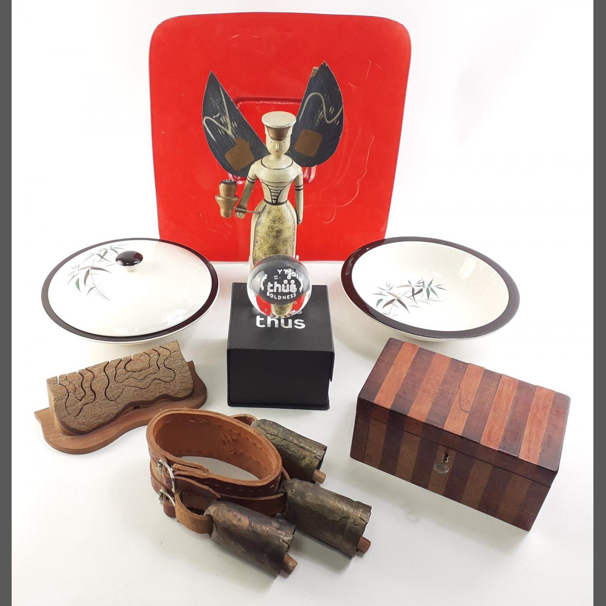 Mixed decorative lot to include a large rectangular red glass serving dish, THUS paperweight, tri-bell leather collar, Royal Doulton serving dishes in "Bamboo" style (only one with lid) and much more
