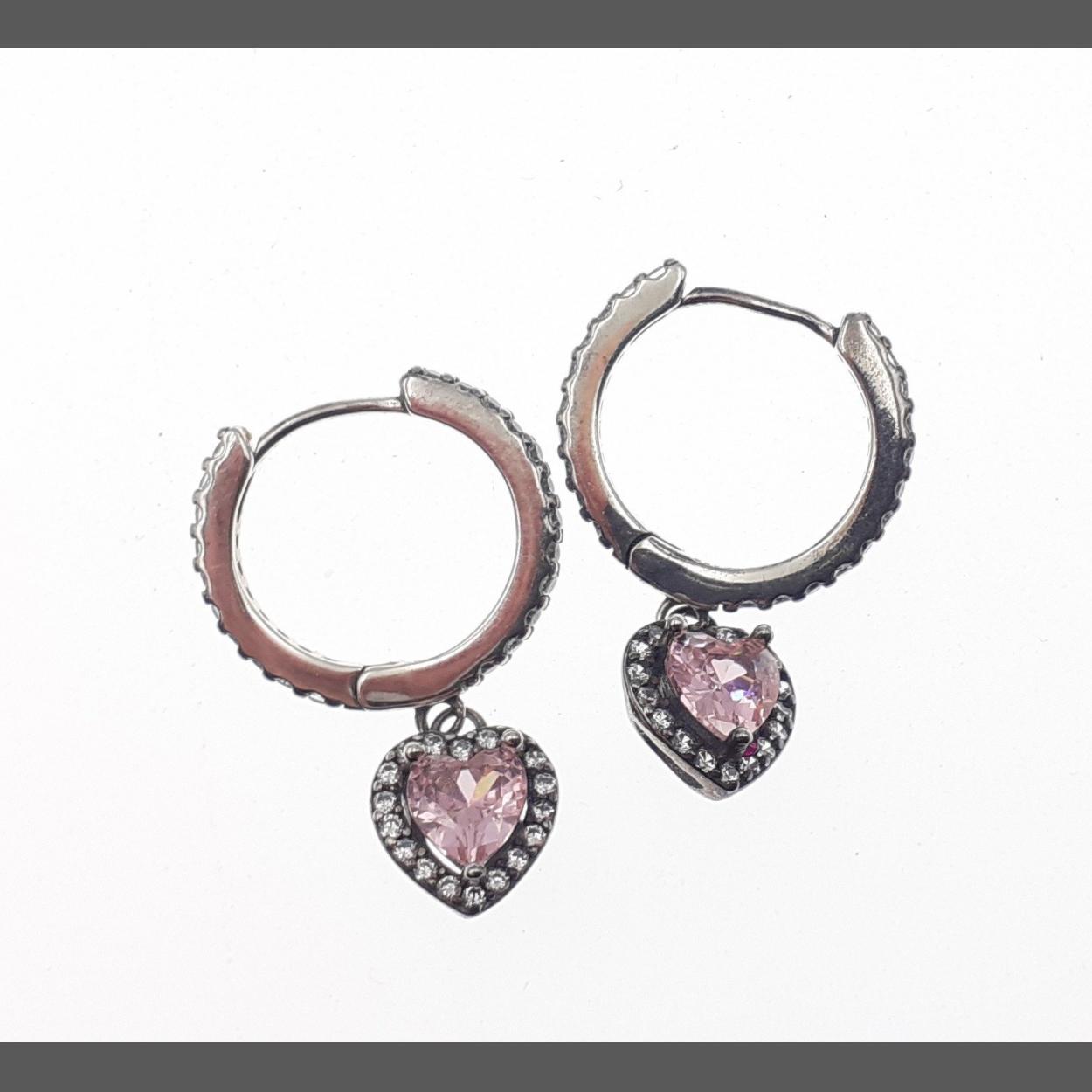 A pair of PANDORA 925 stamped silver earrings with 'dangly' lovehearts with a pink stone centred in each - gross weight 3.45g approx - comes complete with its original Pandora box and the presentation bag