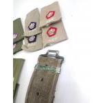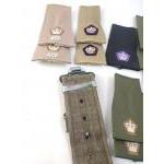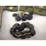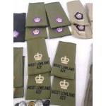 A wee box filled with vintage MILITARY buttons, a canvas belt and a bundle of ARMY CADET FORCE shoulder lapels