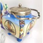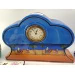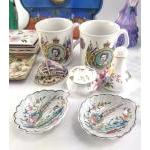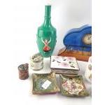 Decorative ornament lot to include Arabian scene ceramic mantle clock, 2 jubilee mugs, various trinket dishes, table lighter, green carafe etc