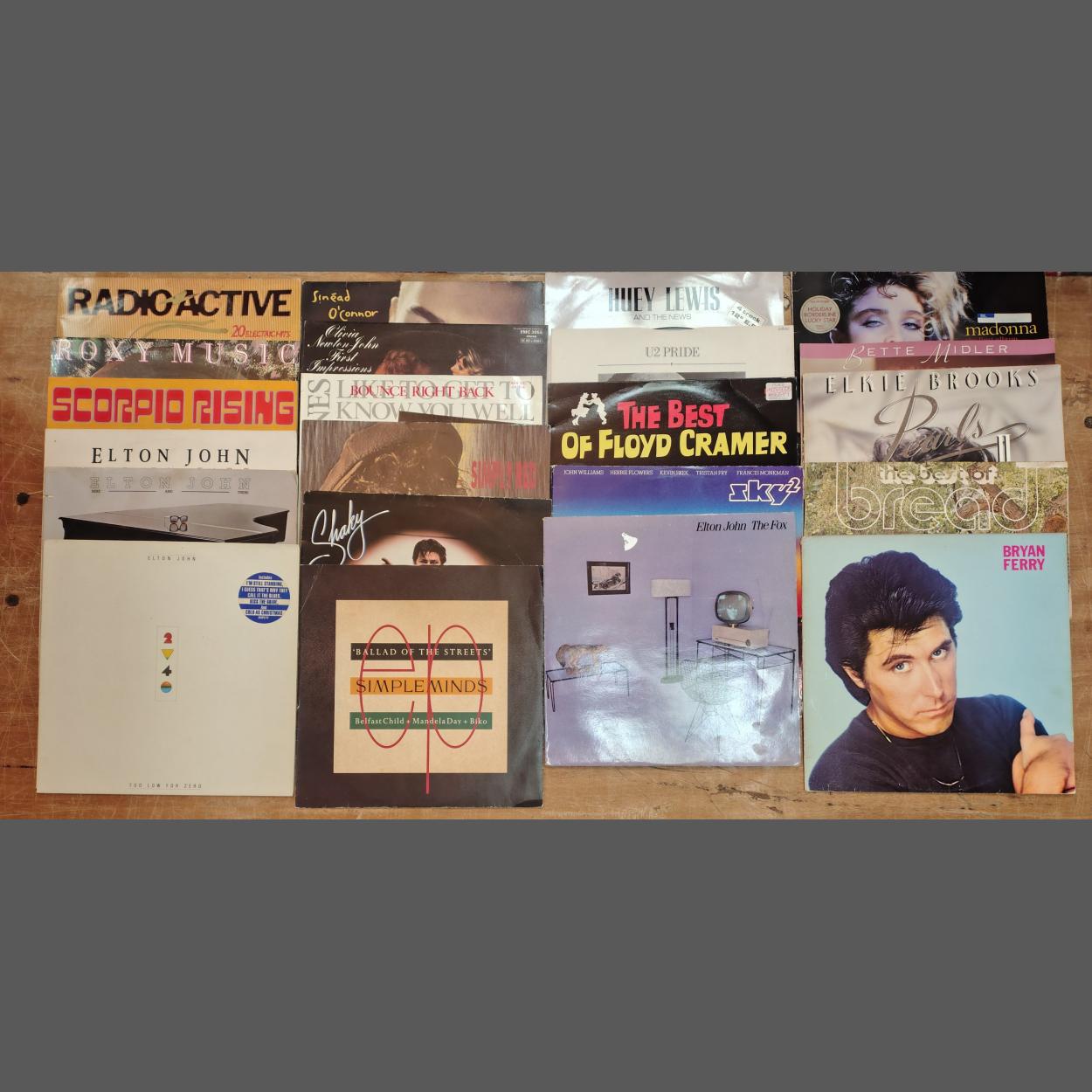 Collection of 20 LP's to include Olivia Newton John, First Impressions, SINEAD O'CONNOR I do not want what I haven't got, ELTON JOHN Here and There, Elton John Too Low For Zero, Elton John Ice On Fire, Scorpio Rising, Roxy Music Greatest Hits, Radio Active (with artists signatures on the reverse) Bryan Ferry These Foolish Things, SIMPLE MINDS Ballad Of The Streets, The Best Of Floyd Cramer, U2 PRIDE In The Name Of Love, Huey Lewis And The News The Heart Of Rock & Roll, Shakin' Stevens Shaky, Howard Jones Bounce Right Back, Simply Red Picture Book, SKY2, The Best Of BREAD, Elkie Brooks PEARLS ll, Madonna The First Album, Bette Midler From A Distance and lastly ELTON JOHN The Fox