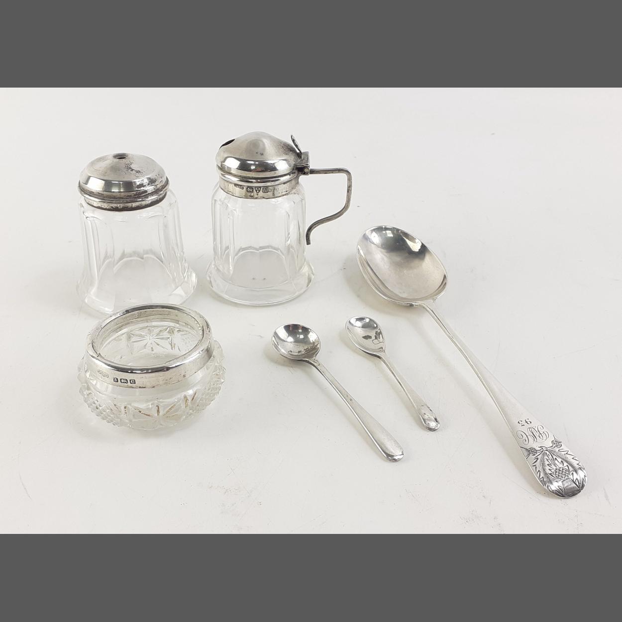 Small collection of STERLING SILVER items. To include dessert spoon and two condiment spoons and three small silver collared condiment dishes. Estimate 45g of silver