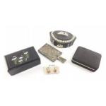 A small collection of jewelley. To include pretty faux red diamond pendant, large gilt chain, mirror, coin mount etc.