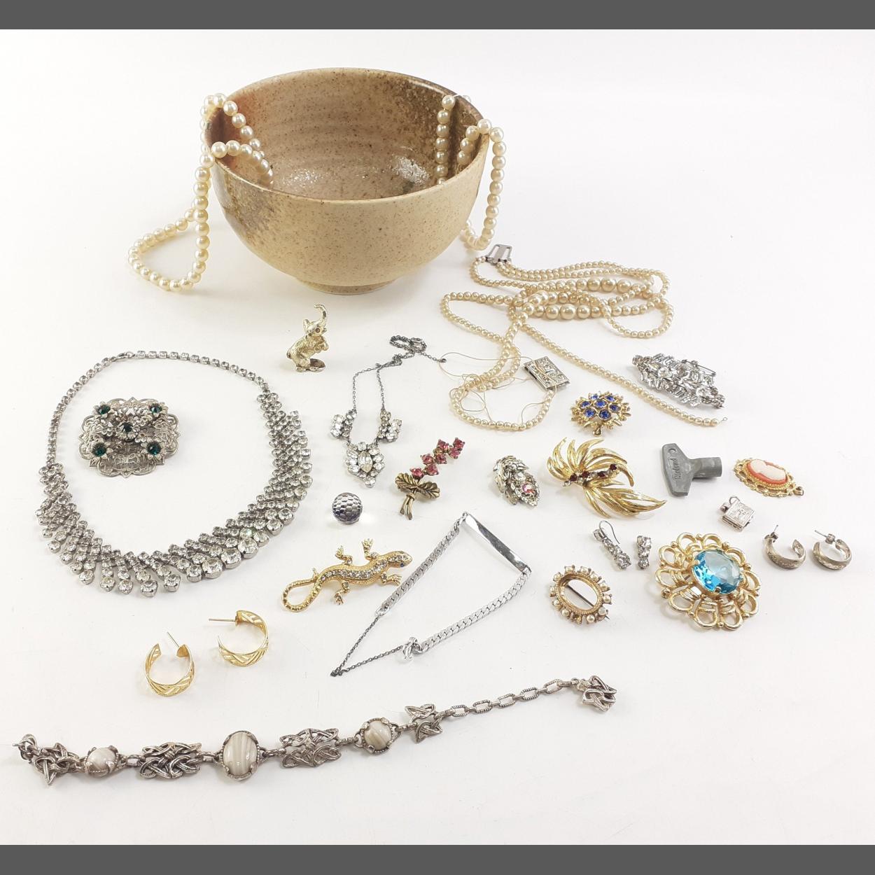 A nice stoneware bowl with a collection of vintage jewellery pieces to include brooches, pearls, etc.