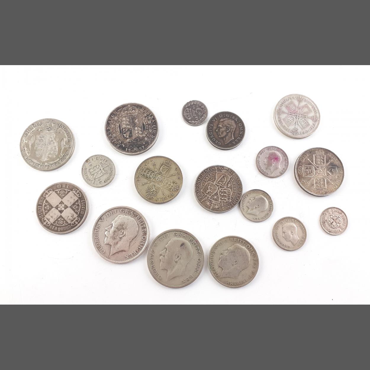 A good little selection of silver coinage. Comprising Victorian and later to include Double florin, 1887 Half Crown and others. Mostly 925 content some later 500, gross weight 140g approx