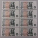 BANK OF ENGLAND eight uncirculated One Pound notes. A sequence of four, another of three notes and one other. Nicely stored, notes still with sheen.