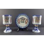 Two attractive Mediterranean style mosaic design goblets and a plate, also a recumbent dog model.