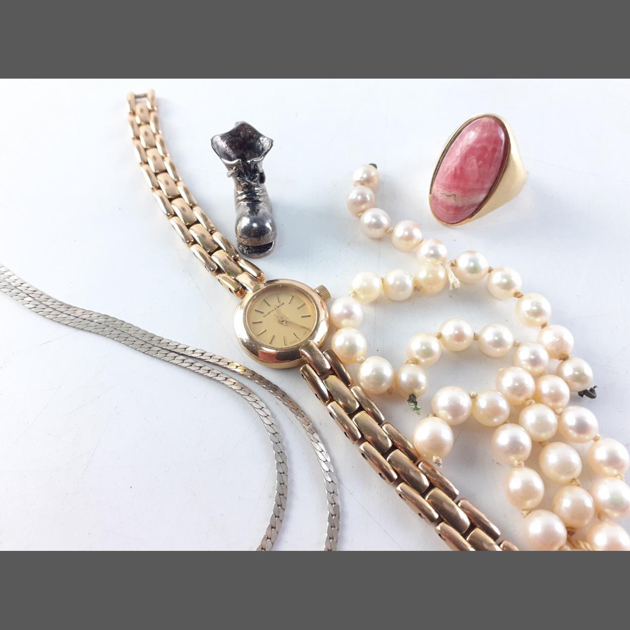 A collection of yellow unmarked ring and ladies wristwatch with also 8.63g of silver boot charm and chain necklace