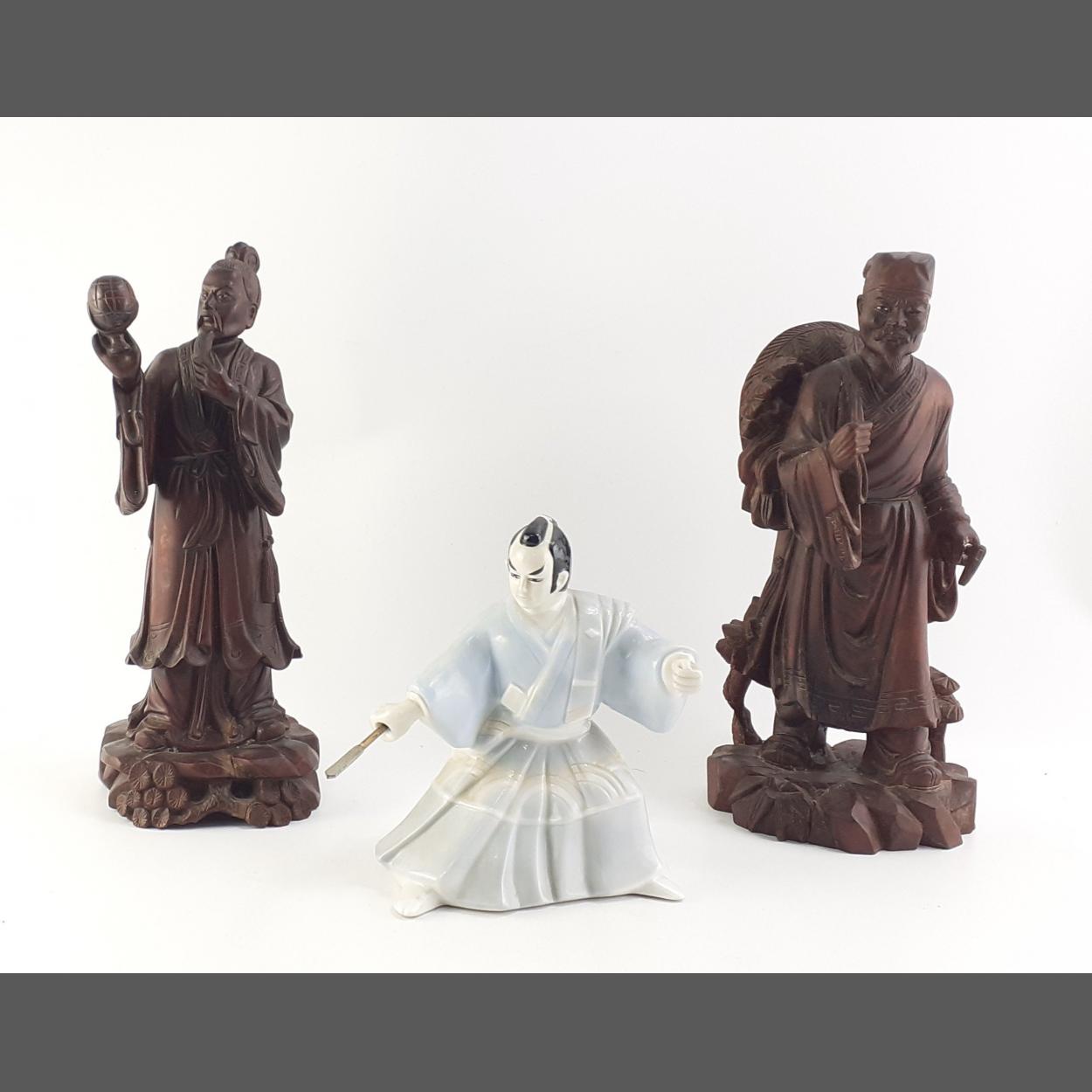 Collection of 3 oriental gentlemen figures. Two of similar design made from wood, other made from china