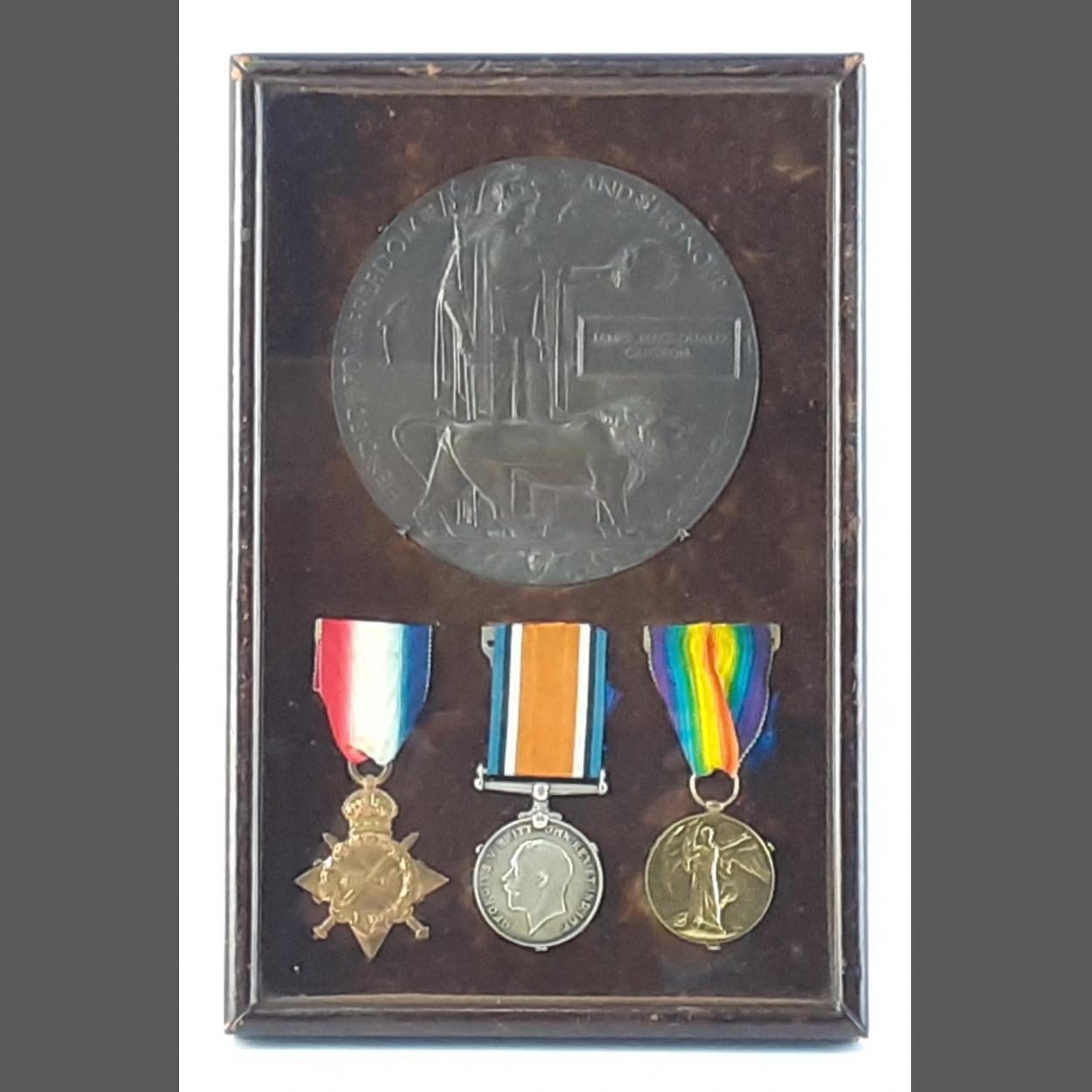A wonderful poignant framed WWI Death Plaque and Medal trio to JAMES MACDONALD CAMERON 2nd Lieut. R.F.A. Beautiful older mount, direct from the family. James was a GALLIPOLI casualty, Killed 10 May 1915.