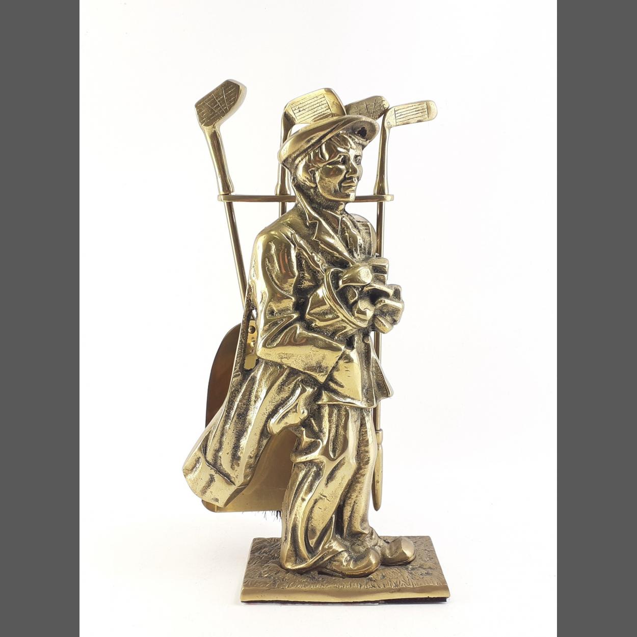 A brass four piece fireside companion set modelled as a golfer, tools as clubs. Unusual!