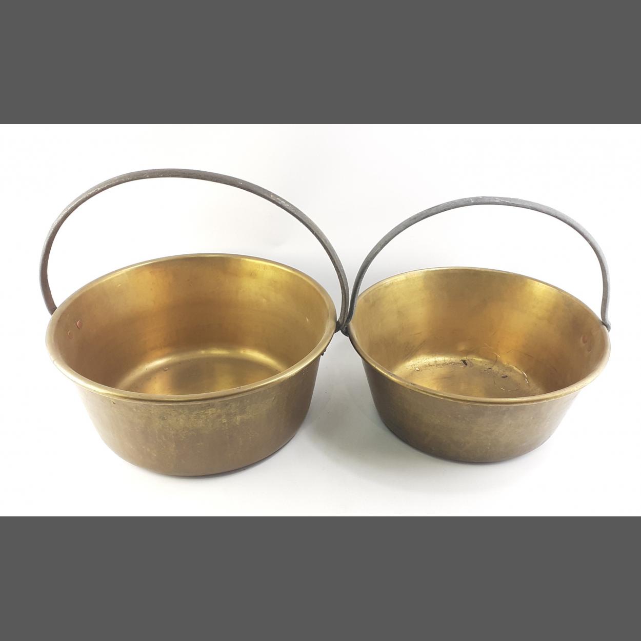 Two vintage brass JAM PANS / Jeely pans in good clean condition. The larger 37cm approx.