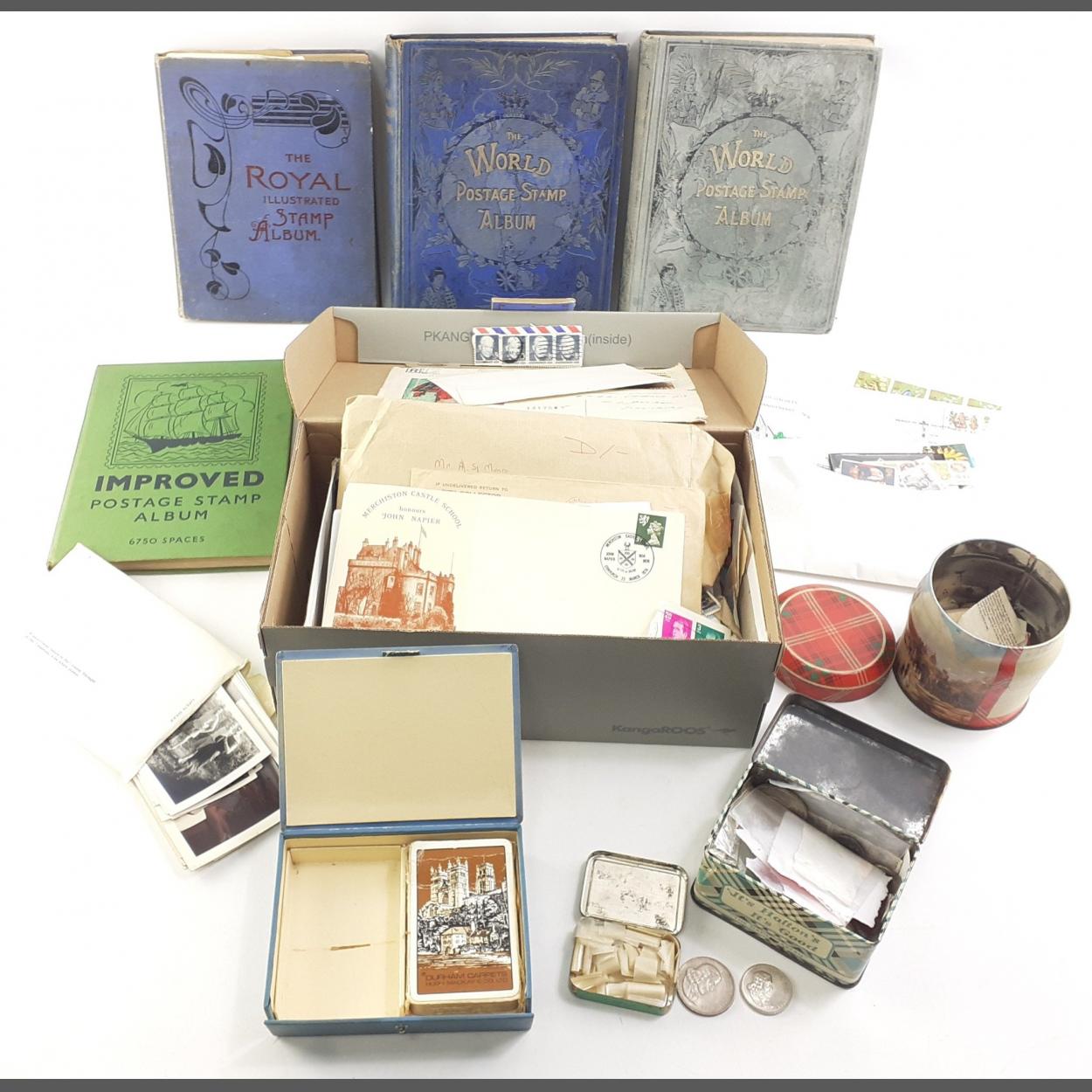 STAMPS. An interesting lot of stamps and related ephemera. Four oklder albums with contents and a shoebox of covers on loose stamps. Albums contain some Victorian and Commonwealth.
