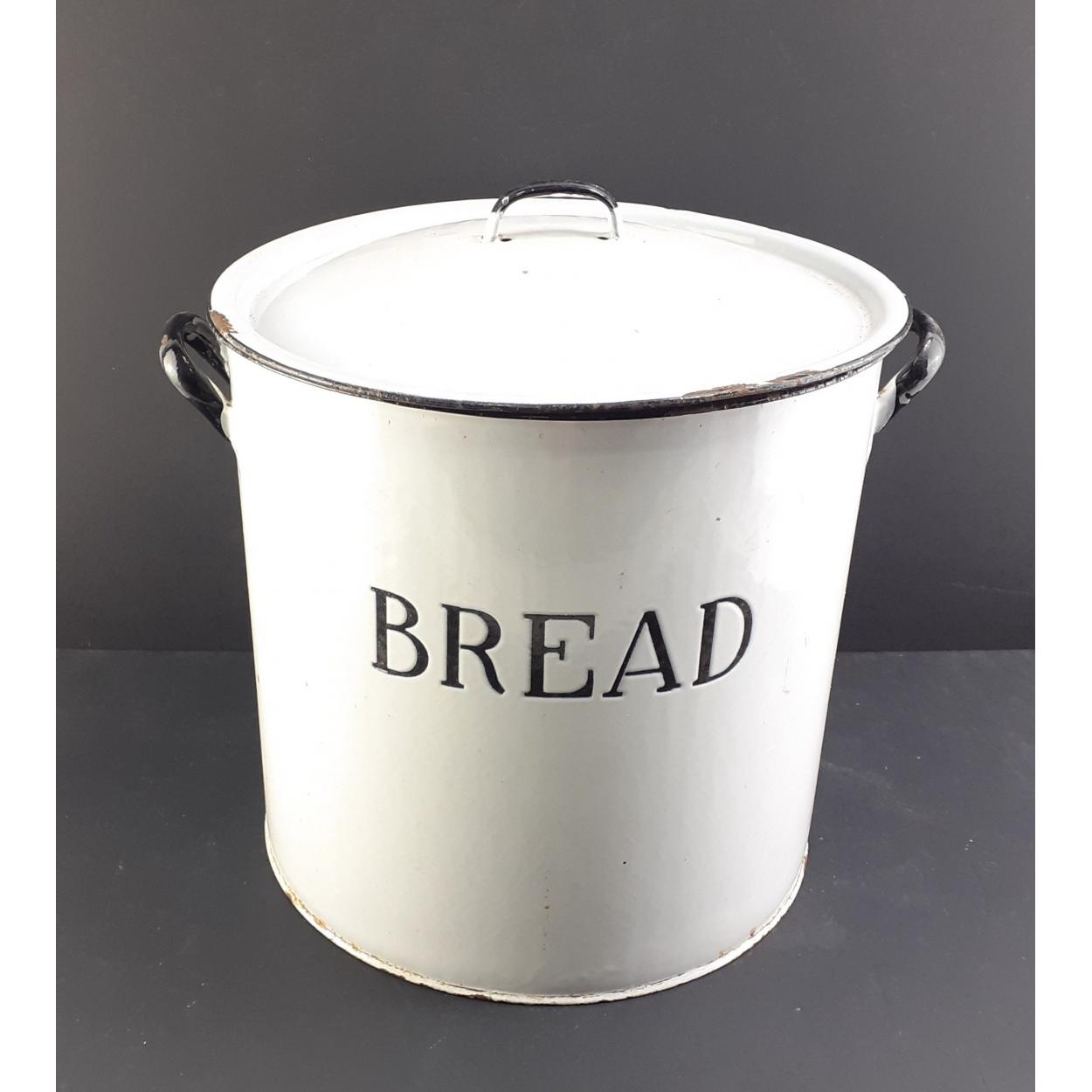 A enamel bread bin with lid. In good condition standing 28cm tall.