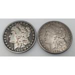 Two USA Morgan Dollar coins. A 1900 and a 1921. Both in fair collectible grades.