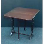 A pretty and useful antique dark wood drop leaf table standing 60cm, measure 60 x 72cm when open. Turne legs, a nice little table.