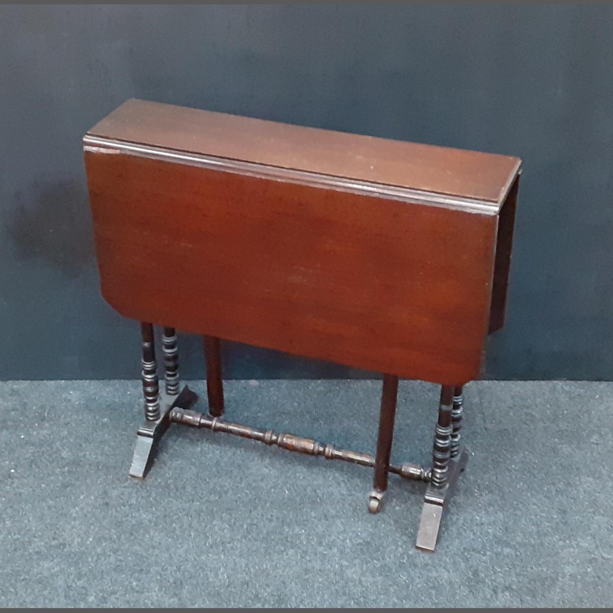 A pretty and useful antique dark wood drop leaf table standing 60cm, measure 60 x 72cm when open. Turne legs, a nice little table.