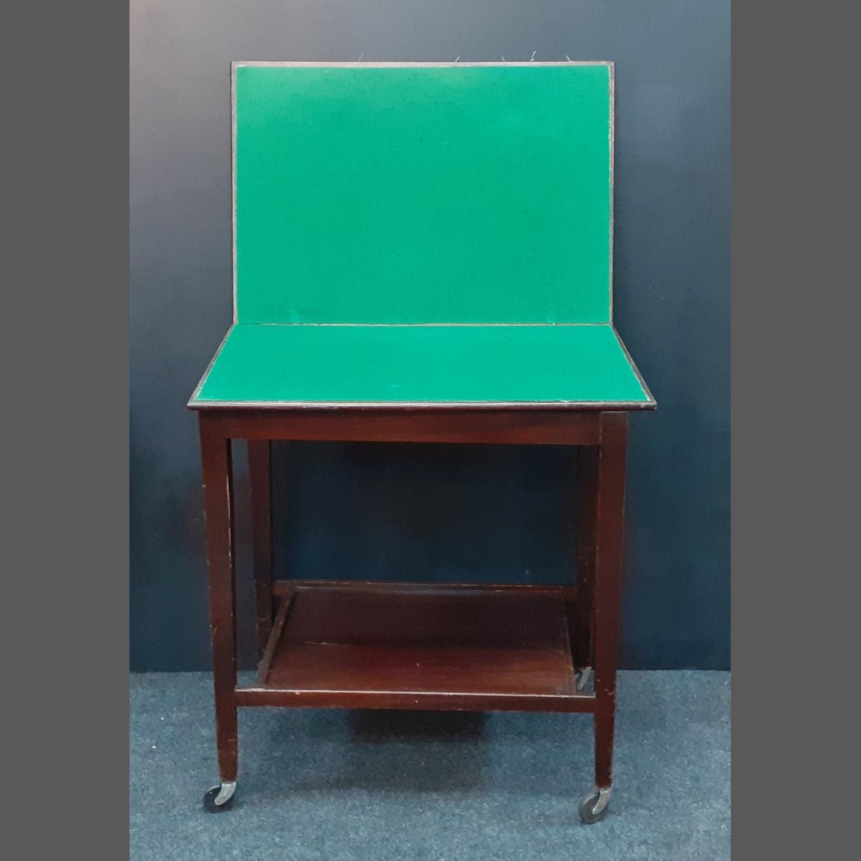 A folding antique card / games table by EASTCRAFT Scotland. Baize in good condition. Top needs a little polishing and refinish but a handy piece. 70cm x 90cm x 65cm when open. A good little piece.