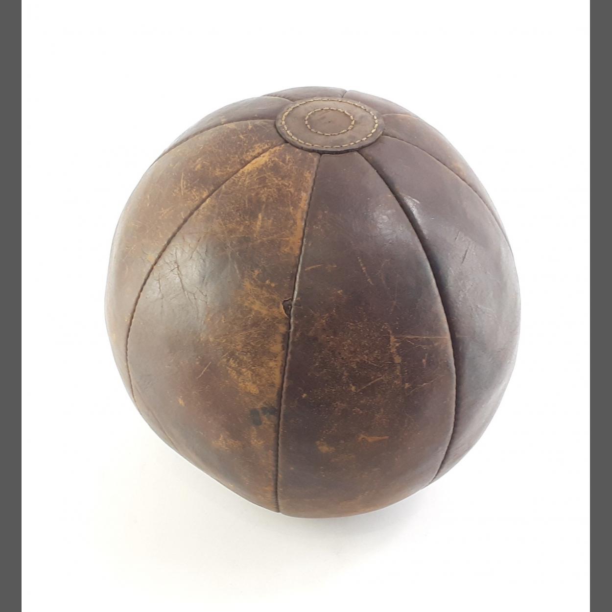 An antique leather medicine ball in good condition. 27cm tall. 90cm circumference.