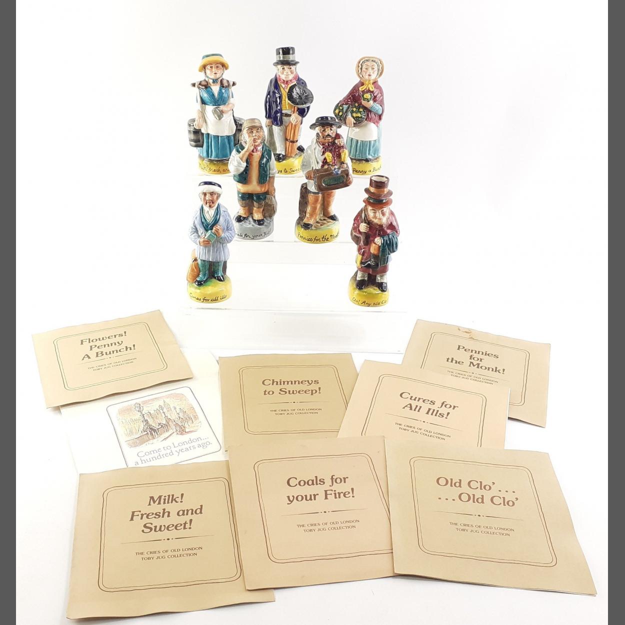 Seven Franklin Porcelain THE CRIES OF OLD LONDON figures with leaflets. Comprising Cimneys to Sweep, Cures for All Ills, Pennies for the Monk, Flowers! Penny A Bunch, Milk! Fresh and Sweet, Coals For Your Fire, Old clo', Old Clo. All pieces are 16cm approx and all pieces in good clean condition. A super set.