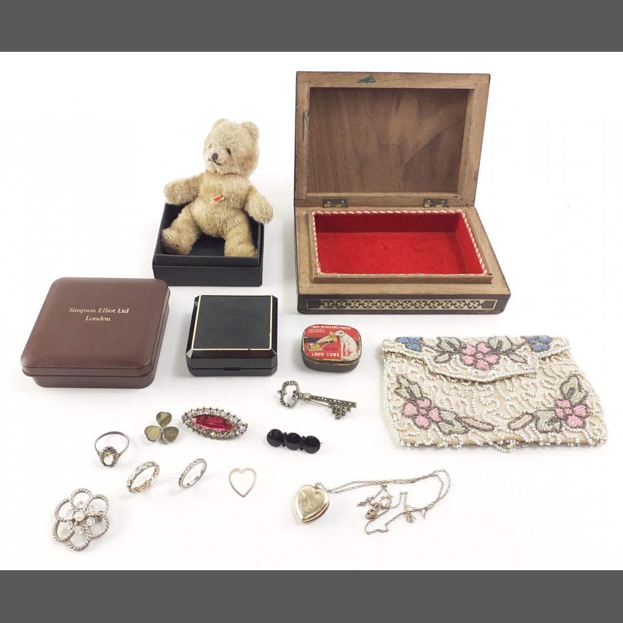Mixed jewellery lot in a marquetry straw work style box, Small brooches , rings etc . Also a lovely wee BERG teddy.