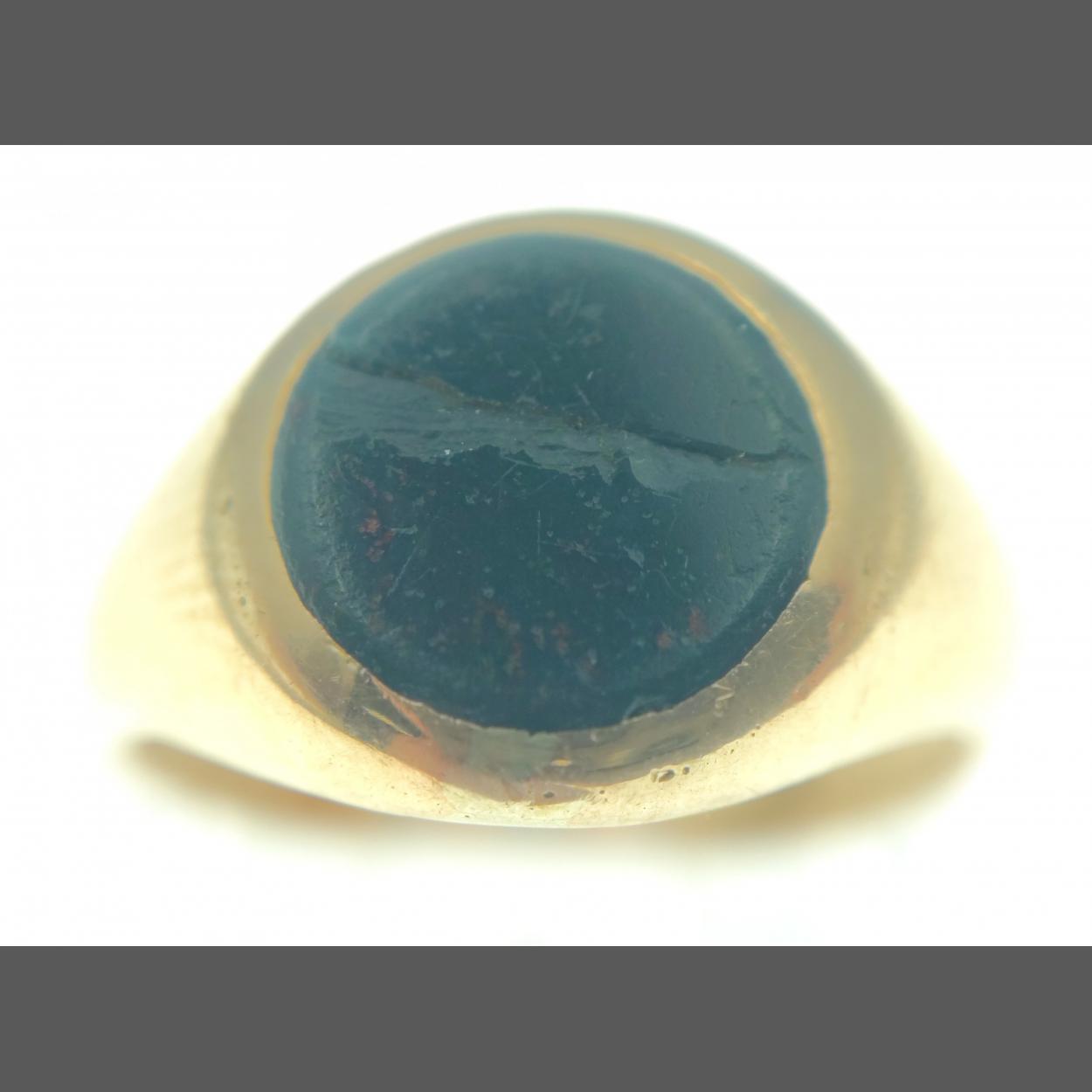 An unmarked yellow metal gents signet ring. crack to stone. Size N, Gross weight 5.5g. NB Jeweller independently tested as 9ct.