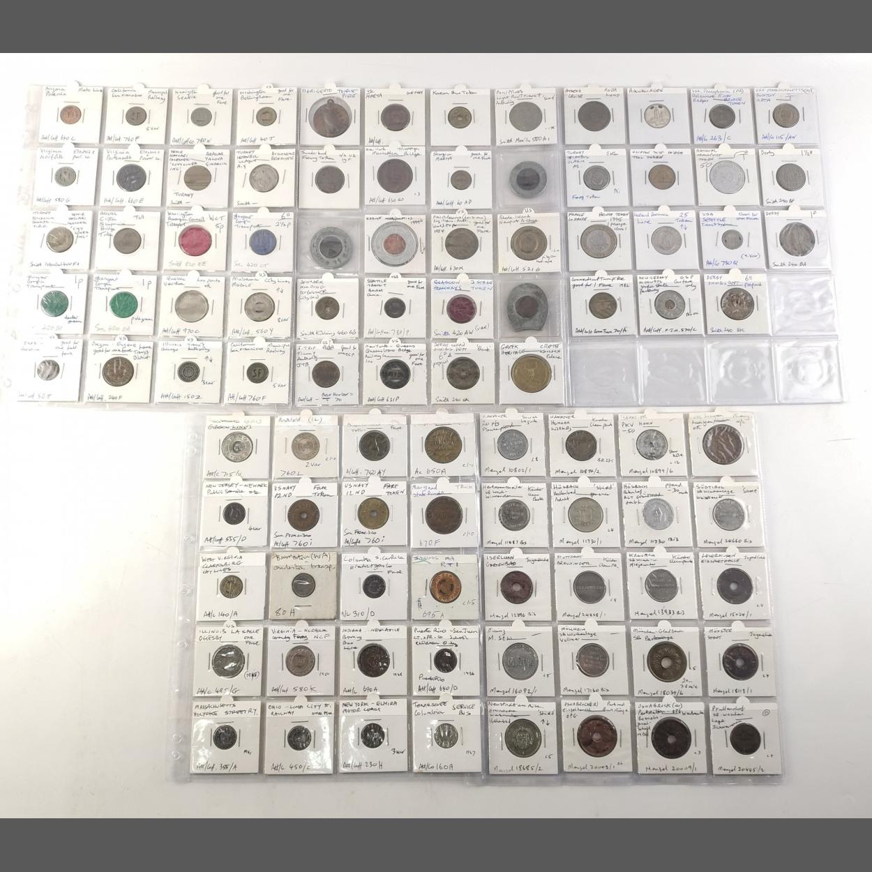 TOKENS 95 assorted tokens. Many USA and world transit tokens. All well stored in sleeves.
