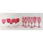 Two sets of six cranberry glasses one with etched floral design all in good condition. The tallest measures 16cm
