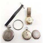 Two vintage silver cased pocket watches and a Gents MuDu wrist watch A/F. two silver watches weigh 99g including movements.