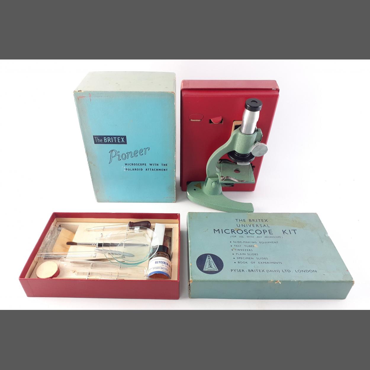A boxed BRITAX Pioneer microscope with accessory kit. Appears in good well stored coondition.
