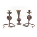 A wonderful pair of vintage Brass COBRA shaped candle holders with matching vase. The vase stands 21cm. All three pieces in good uncleaned condition.
