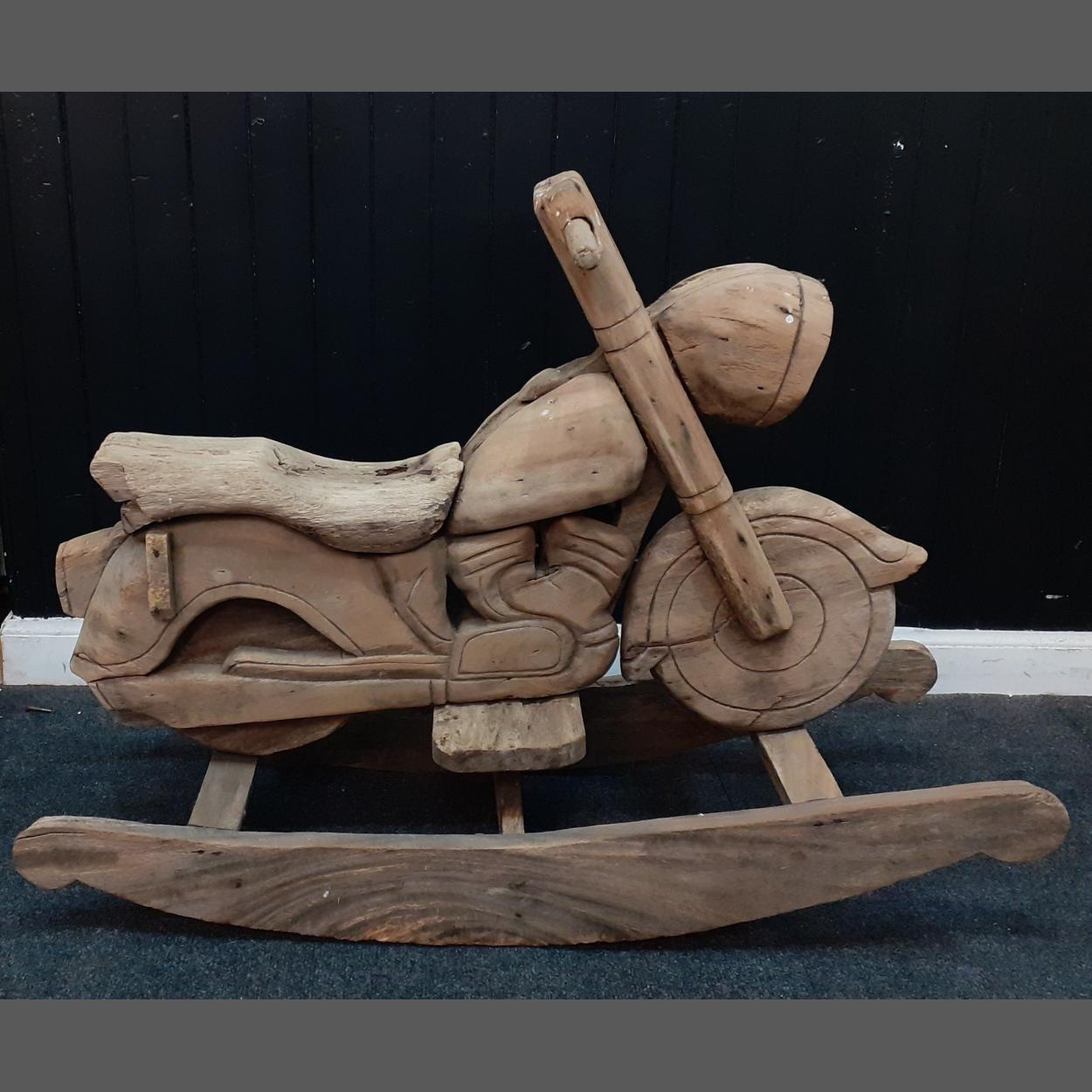 A rustic wooden HARLEY DAVIDSON motorcycle Rocker. In need of a little TLC as worn in places but an unusual and desireable thing ! 60cm tall and 80cm wide.