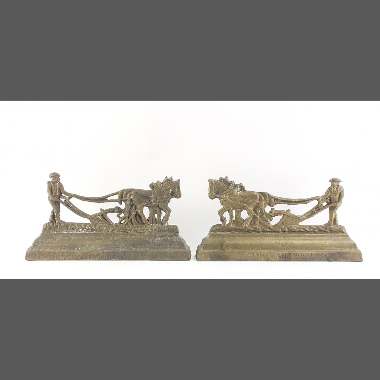 RABBIE BURNS brass door stops with ploughing scenes. Each 28cm wide.