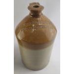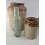A stoneware flaggon from JENSON & NICHOLSON London & Stratford. Stands 32cm tall. Aso two other smaller stoneware pots and an antique bottle.