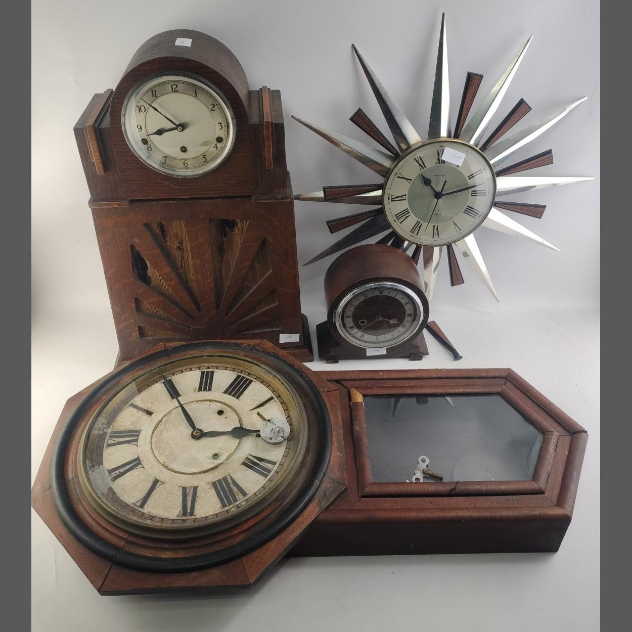A collection of four vintage clocks and an antique wooden speaker. All untested.